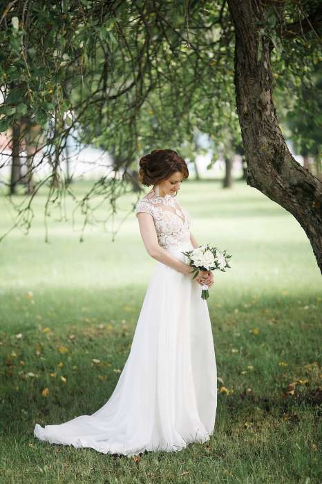 Продам дизайнерское платье от Татьяны Каплун. Цвет Айвори. Лиф без корсета, расшит белым бисером. Трехслойная юбка с шлейфом. Платье очень легкое, удобное. Размер 40-42 на рост 156-158, возможно обрезать юбку. Есть палантин по желанию. Платье надето один раз для фотосессии, было в химчистке. Состояние идеальное.