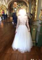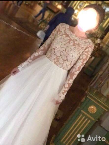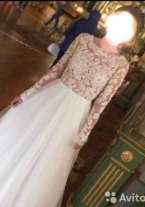 Платье сшито на заказ. Состояние идеальное. Надевала с каблуком 5-6 см, как видно на фотографии. Спереди все расшито кружевом, рукава тоже, красиво садиться, надевала чашечки съемные вместо лифчика. Сзади застегивается на пуговки и также расшито кружевом.