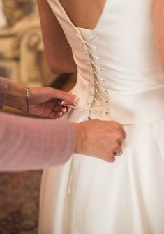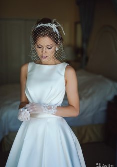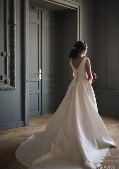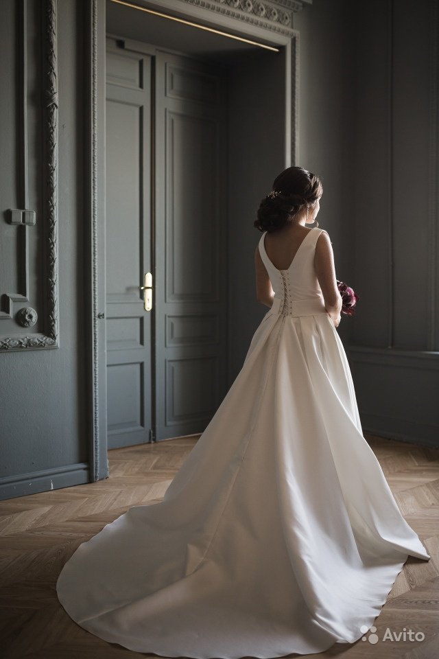 Шикарное платье со шлейфом из качественной атласной ткани. Практически не мнётся. Есть удобные карманы по бокам. Сзади корсет, благодаря которому садится хорошо на разную фигуру. Лифчик надевать не требуется. Смотрится очень эффектно, ничего лишнего, утонченное и стильное. Надевала 1 раз на свадьбу. Платье в идеальном состоянии, после химчистки, хранится в чехле. Покупала новое за 35 тысяч. На фото как мои фото, так и фото из интернета этой же модели. Сзади есть петелька для крепления шлейфа.