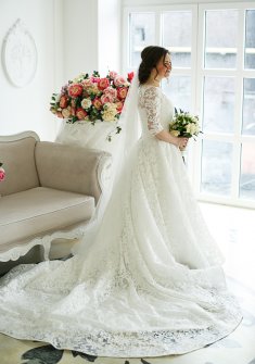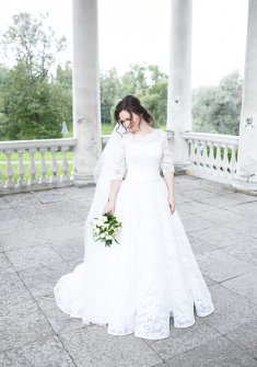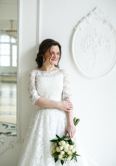 Превосходное свадебное платье! Шилось на заказ, поэтому существует в единственном экземпляре :) Платье в идеальном состоянии. Подходит для венчания в церкви. Размер 42-44. На шнуровке + декоративные пуговки на спине. Шлейф можно носить во всю длину или подколоть. В комплекте кринолин (самый маленький, объема юбке не добавляет, используется для удобства передвижения, чтобы не запутаться в подъюбниках) Также есть петелька, чтобы носить шлейф в руке (очень эффектно для фото)