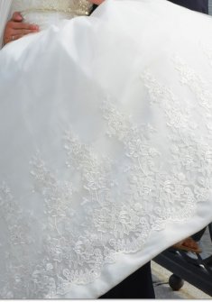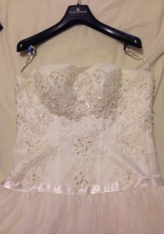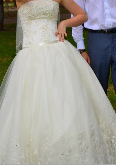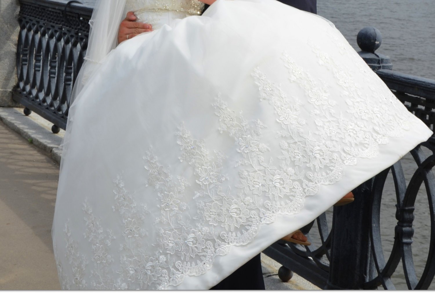 Свадебное платье. Верх - классический корсет со шнуровкой, вышивка, стразы, искусственный жемчуг; юбка - вышивка, немного страз. Подъюбник мягкий, очень пышный, без колец (выглядит очень красиво с ним), размер 46-48 (регулируется корсетом, возможно и на 50 подойдет). Есть небольшой шлейф, который поднимается и крепиться для удобства. К платью подарок - фата (средней длины, по краю окаймление нежными стразами) + плотный чехол для удобства хранения и перевозки.