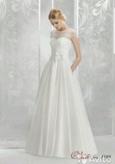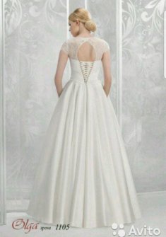 Цвет айвори, атлас. Платье надевалось только на фотосессию, после наряд менялся. В платье есть карманы, сверху красивое кружево. Возможен торг.