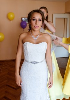 Продаю мое счастливое платье))) Силуэтное кружевное платье с мягким корсетом. В комплекте болеро. Пояс с камнями в подарок!!! Фата продается отдельно кружева подходят.(1000р) Платье очень удобное и эластичное, не сковывает движения. Платье подшито на рост 160 и высокие каблуки с платформой, так что подойдет для роста 160-165 ) Отдам самой счастливой невесте.