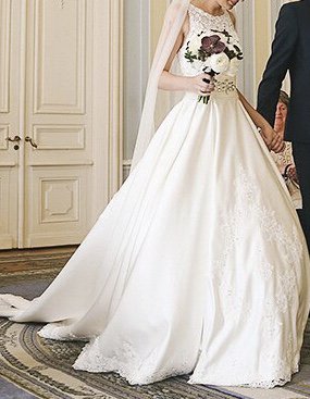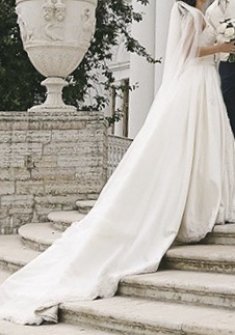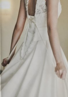 Изысканное атласное платье, длинный шлейф подкалывается сзади. Корсет на прочной шнуровке. После химчистки.