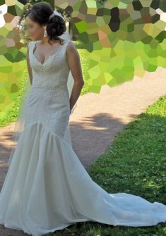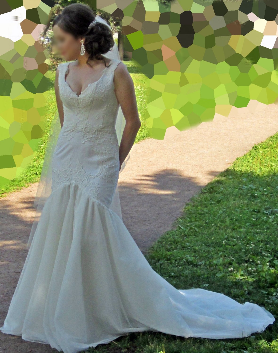 Свадебное платье ELENA CHEZELLE со шлейфом. Фасон русалка/рыбка. Цвет айвори. Размер 44-46. На корсете (шнуровка на спине). Без пайеток, блесток, жемчуга и т.д. Отделка удивительно красивым кружевом. Состояние идеальное, после химчистки. Шлейф можно собрать на руку (есть петля). Подойдёт для стильной современной или винтажной свадьбы. Без кринолинов и т.д., очень удобное, в т.ч. во время прогулки или танцев, движения не стесняет. Покупалось за 31000. Могу выслать больше фото по запросу.