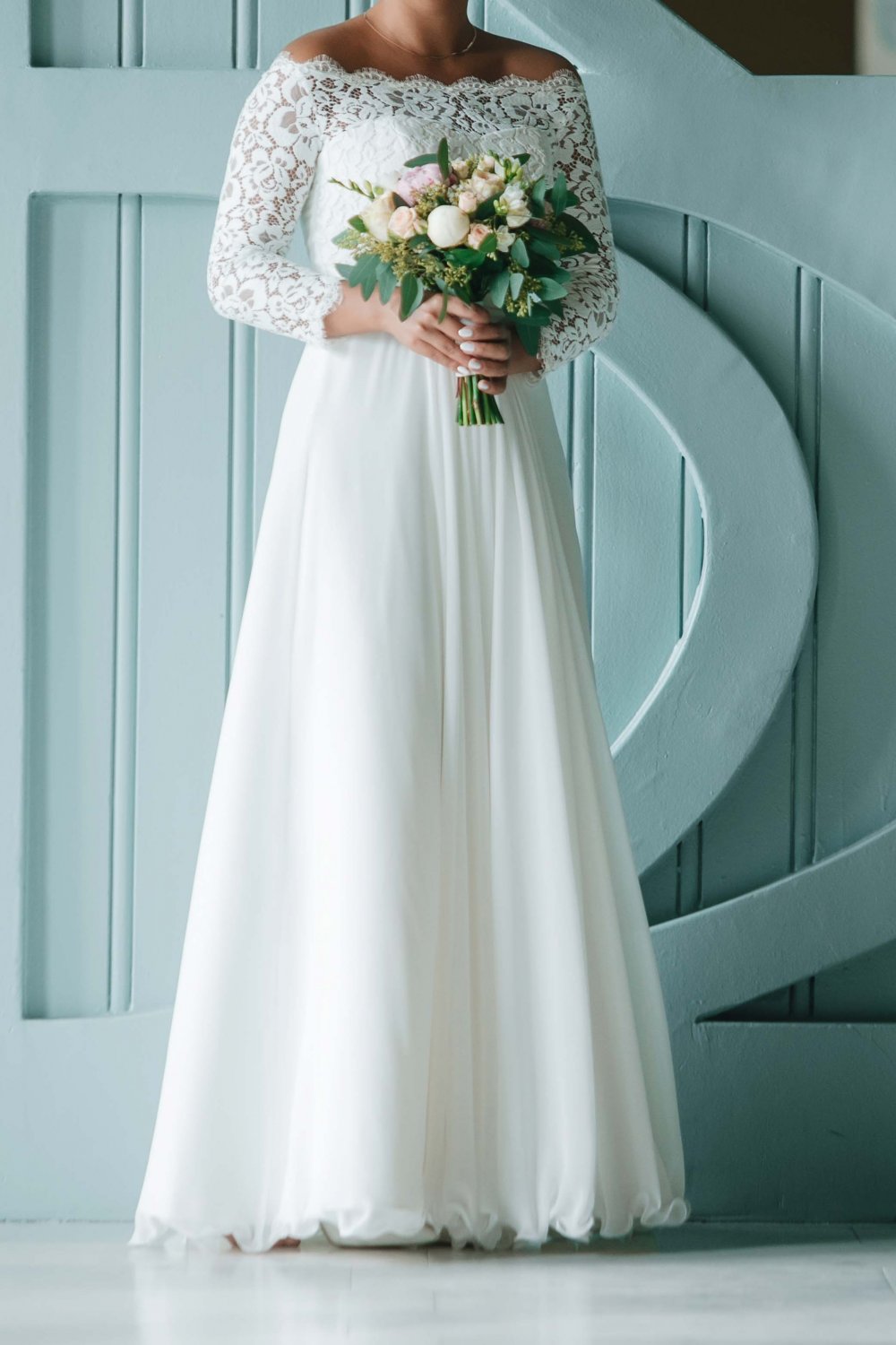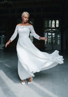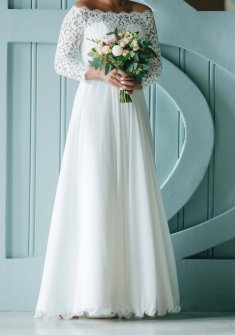 Продам свадебное платье А-силуэта с красивым кружевным лифом и закрытыми рукавами. Размер 44. Подол был укорочен, чтобы не пачкать платье (мой Рост 165см+8см каблуки). Надевалось 1 раз на свадебную фотосессию с последующей регистрацией. Чехол прилагается. Платье сдавалось в химчистку.