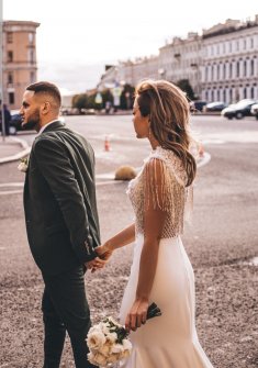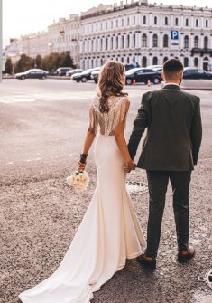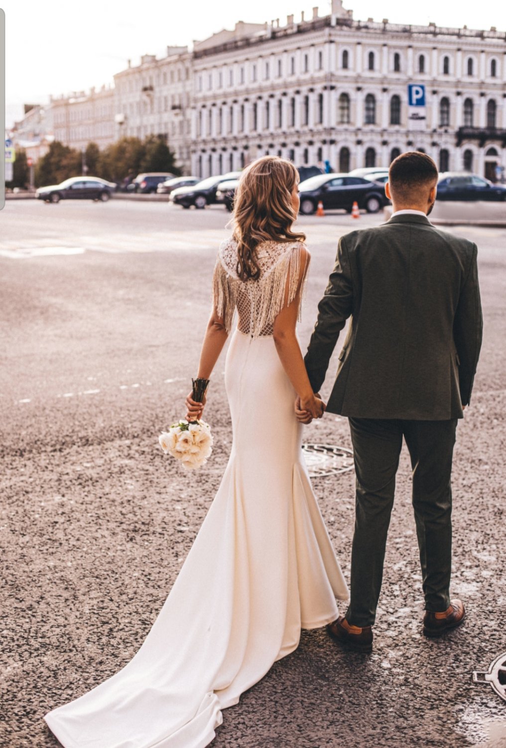 Силуэтное свадебное платье в цвете молоко. Спинка корсета на пуговках и молнии. Вырез корсета - закрытый. Корсет декорирован провесами, шлейф венчального кроя. Платье в идеальном состоянии, было куплено за 45 000 руб. (информацию можно проверить на сайте) Платье действительно очень необычное и влюбляет в себя с первого взгляда)) Пишите, отвечу на любые вопросы)