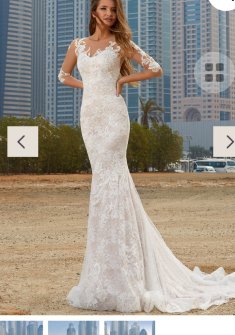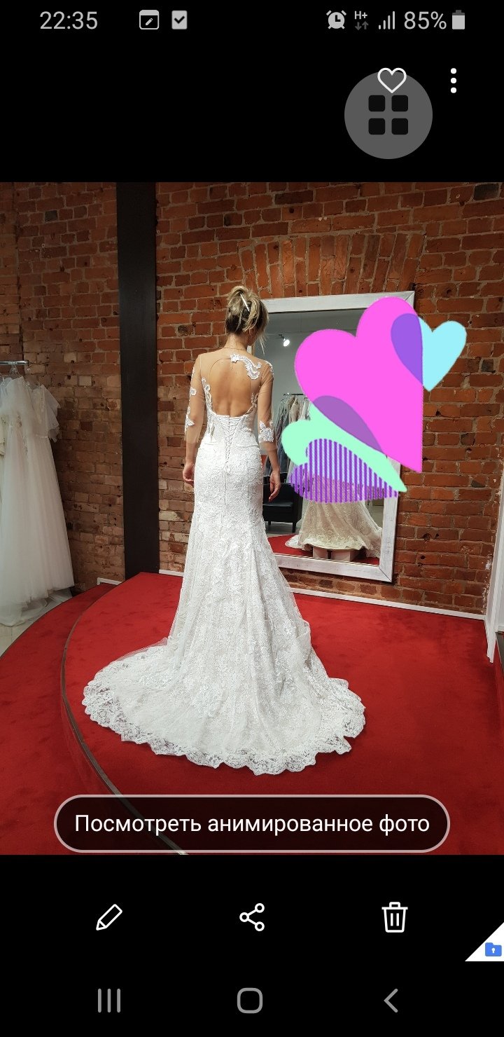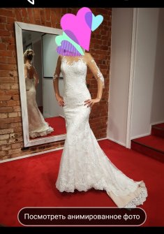 Продам счастливое платье "рыбка" LANGO итальянский бренд, надето только на церемонию (на море) подойдет на рост до 1.70. Полностью кружевное, выполнено из нежного гипюра с изящным шлейфом с фалдами, а корсет покрывает топ с рукавами ¾ и кружевными аппликациями. Они образуют эффект V-образного выреза спереди и роскошного фигурного декольте на спинке. Состояние идеальное, химчистка не требуется! Внизу имеется шлейка (ручка), т.е платье можно держать за нее в руках, не волоча по полу.