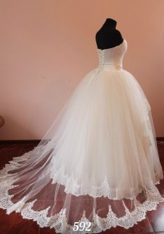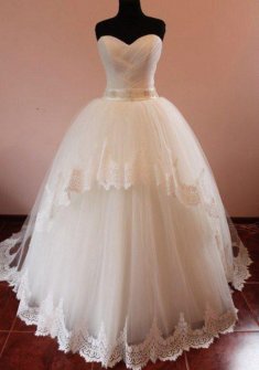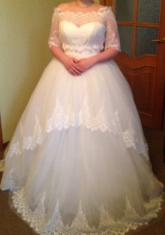 Размер 48-50, шлейф крепится на крючок к юбке, на рост 170 плюс каблук - идеально. Пояс без страз, атласная лента. Очень красивое кружево и удобный корсет, нигде ничего не трёт и не передавливает, пышная юбка, легко можно надеть даже без подъюбника (колец) - держит форму за счёт многослойности. Болеро в подарок.