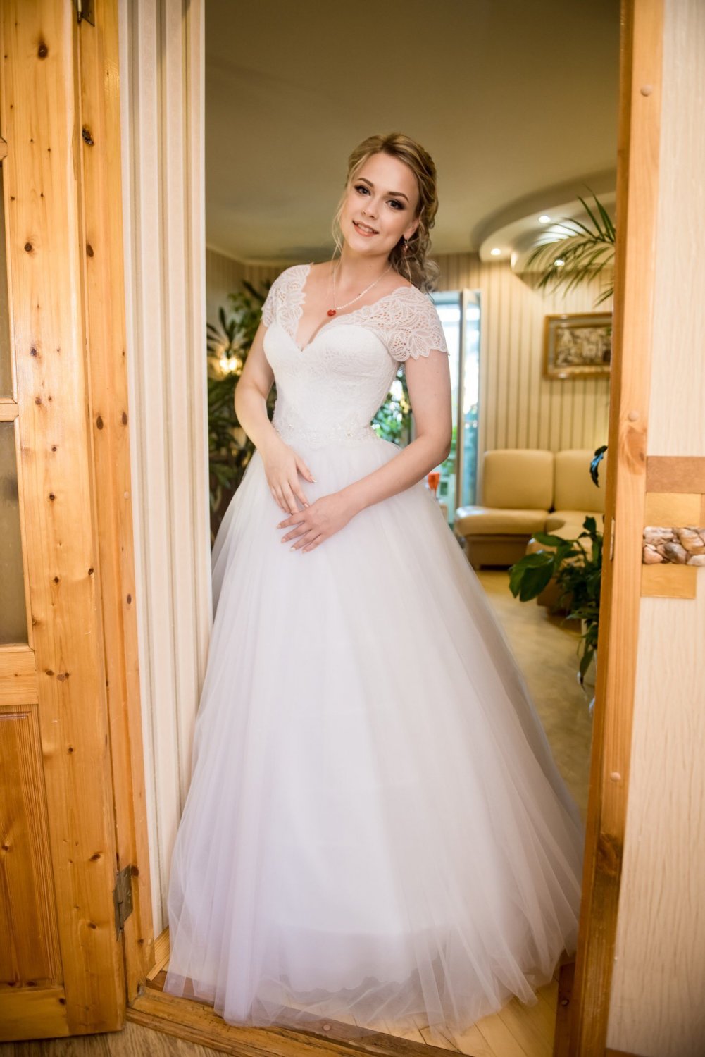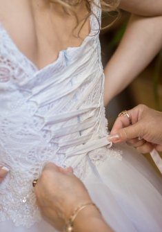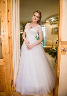 Сзади регулируется шнуровкой, плечики кружевные. Платье использовалось один раз, в аренду не сдавалось. Очень удобное. Можно как с кринолином, так и без.