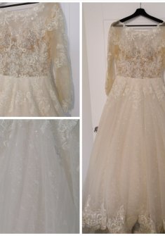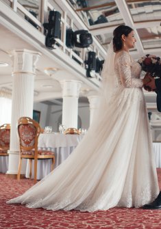 Продам свадебное платье, надевалось 1 раз, состояние отличное, но требуется химчистка. Размер М, на шнуровке, вполне подойдёт и на другие размеры (42 - 46), рост 167+каблук. Юбка имеет несколько слоев из разных фактур, расшита пайетками, очень красиво мерцает. С платьем проводились работы: вставлены чашечки, укорочен шлейф, под горло нашиты кружева. В подарок украшение ручной работы в свадебную прическу. К платью имеется чехол.