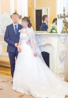 Дорогие невесты) Продаю свадебное платье испанского дизайнера. (На рост ~160-169 см) Покупала в салоне за 70 000. Надевалось 1 раз. Платье с аккуратной вышивкой. Невероятный шлейф сделает Ваш образ королевским. В подарок к платью отдам оригинальное кружевное болеро и подъюбник. Будьте разной на Вашем празднике! Платье продаю в чехле. Сделаю скидку 3000 на отпаривание. В чехле объёмное платье замялось. (p.s. На фото образ с болеро)