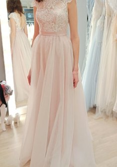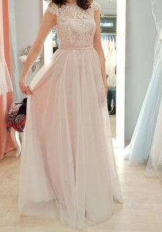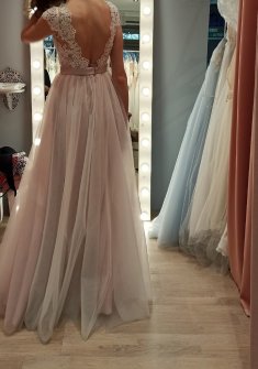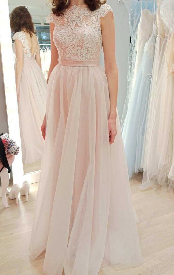 Легкое воздушное, удобное и очень красивое. Пышное платье с кружевным корсетом и небольшим рукавчиком. Верх выполнен из объемного кружева с мерцающим оттенком и открытой спиной. Фактурный верх и юбка из невесомого, легкого фатина делает платье невероятно эффектным. Корсет невидимый под кружевом, само кружево очень приятное к телу, пояс подгоняется под необходимую фигуру. Платье без подгона, село идеально и на фигуру и рост. Подогнать по длине можно во многих ателье без проблем.