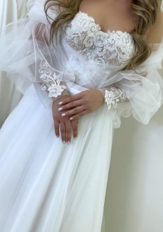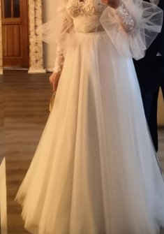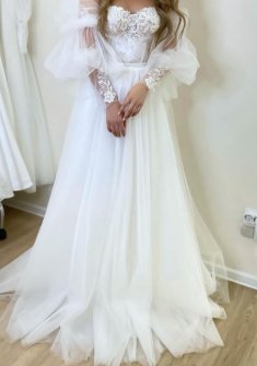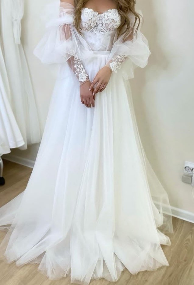 Продаю свое свадебное платье, состояние идеальное. Модель очень красивая и необычная, все комплименты будут Ваши. Рукава съёмные. Спинка у платья шикарная. Размер 44-46. Регулировка корсетом. Цена 40тр.