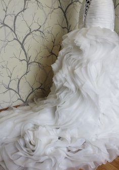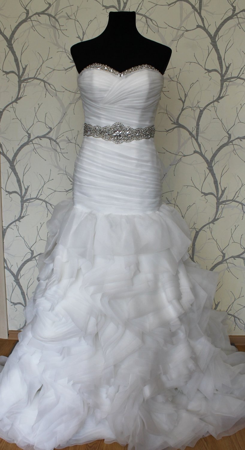 Продается итальянское свадебное платье силуэта "рыбка", купленное в салоне "angel a bridals" за 64200 руб. В отличном состоянии, было надето на пару часов в помещении. После химчистки. Платье украшено стразами в области лифа и пояса, дополнено силиконовой лентой в области груди для комфортного ношения и вшитым корсетом. Имеется съемный пуш-ап. Сзади красивый и объемный шлейф и спинка на шнуровке (ленту использовала атласную цветную), родную ленту от платья не нашла. В комплекте подъюбник.
