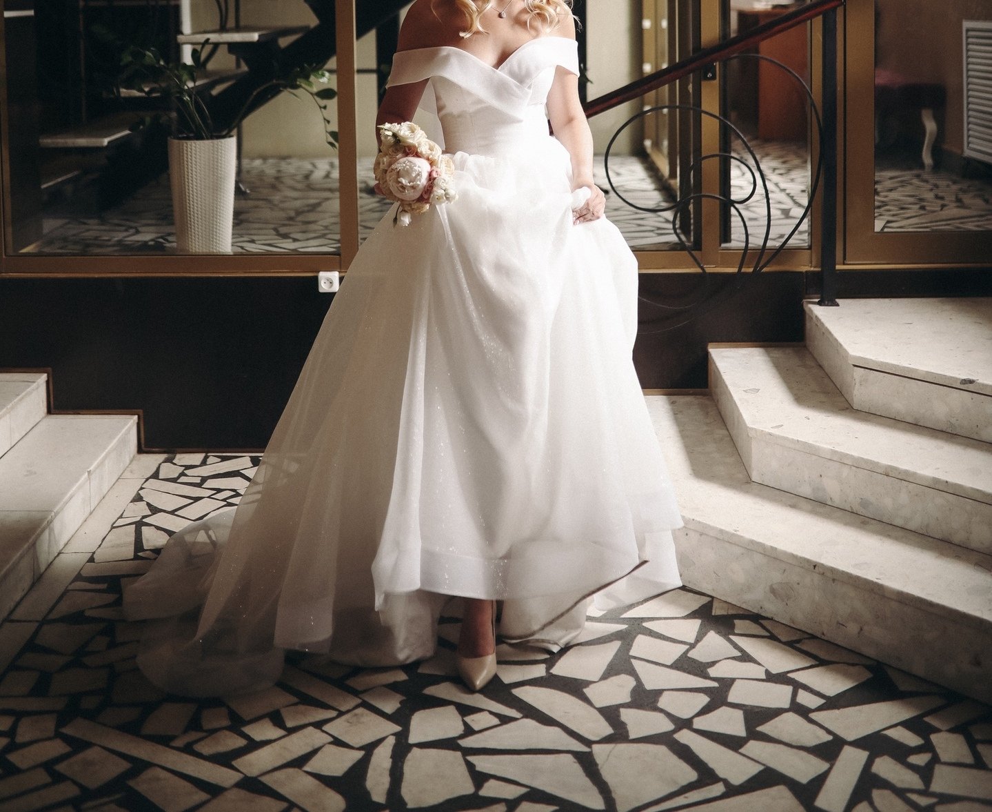 Продам свадебное платье, состояние отличное. Размер подойдёт на 44-46, регулируется в талии за счёт косета. Ткань глиттерная, очень красиво сияет, модный фасон, есть шлейф. Покупала за 30000 руб., продам за 10000