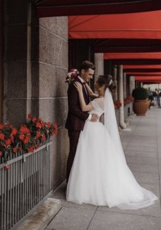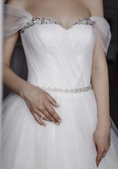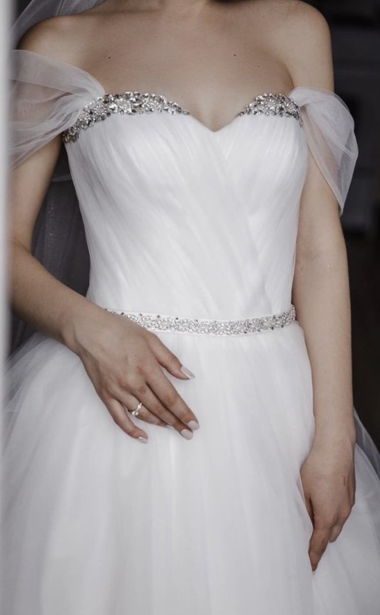 Свадебное платье с небольшим шлейфом, открытое декольте, имеются небольшие пышные плечики. Корсетное, поэтому подойдёт на размер (XS-M). Укороченное на рост 165-170 (мой рост 160 + 15 см каблук). Цвет: молочный. Цена: 17.500₽. Покупала за 26 000₽ + 1000₽ кринолин. Надевала 1 раз, после свадьбы отдала платье в химчистку, чистое и отглаженное, все стразы на месте, состояние отличное, в корсет вшиты вставки под грудь, к платью прилагается кринолин.
