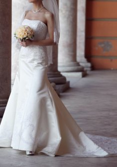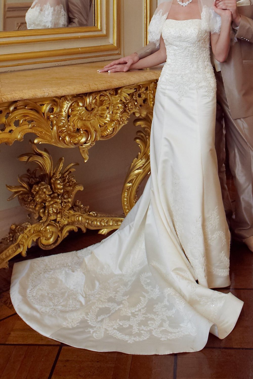 Эффектное и элегантное дорогое свадебное платье (новое платье стоило около 700 евро). Верхняя часть и шлейф расшиты кружевом и бисером. Шикарный шлейф для лучших фото. Для ходьбы его можно прикрепить к платью сзади или надеть петельку на палец. Внутренний корсет и чашечки. На фото рост 165 см. Торг уместен.