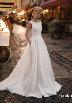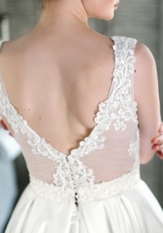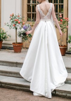 Атласное свадебное платье с открытой спиной и шлейфом. Цвет айвори, пояс и плечи вышиты жемчугом и стеклярусом. Вшиты чашки пуш-ап в топе под покладкой. Вшитая внутренняя юбка. Имеется внутренний крючок для шлейфа. Платье подшито на рост 170 + 3-4 см каблуки. Размер 42 (Рос), на талию 65-75 см, на грудь объемом 80-90 см Состояние отличное, после химчистки, подол и подмышки белоснежные. В комплекте с кринолином (одно кольцо) и чехлом.