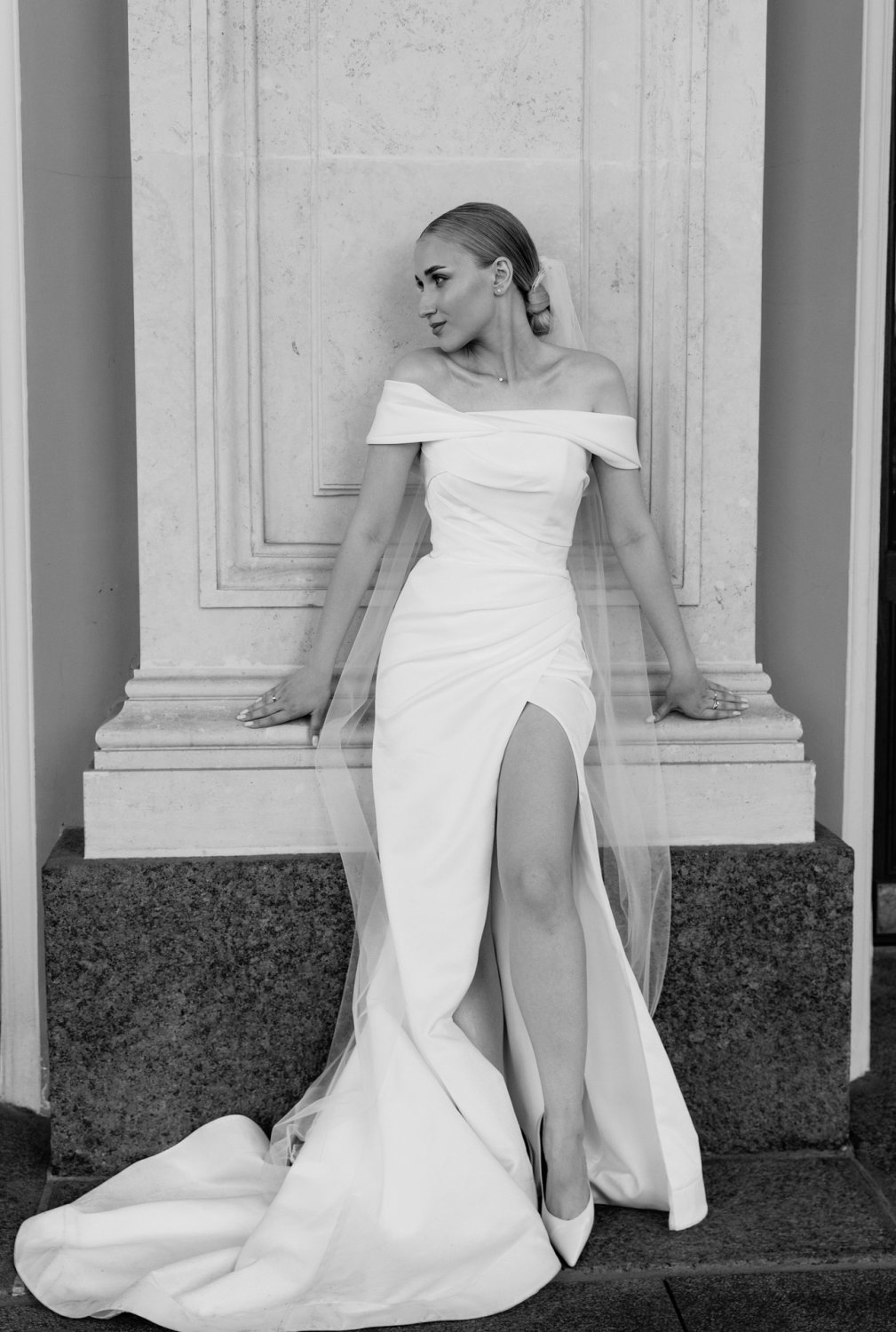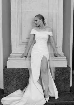 Модель выполнена в классическом A-силуэтном крое. Задрапированный открытый лиф делает акцент на зоне декольте и хрупких плечах, прекрасно гармонируя со спущенными рукавами. Спину украшает изящная шнуровка. Длинная юбка в пол с глубоким пикантным вырезом завершается роскошным шлейфом.