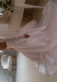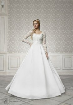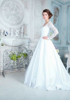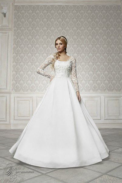 Платье новое и очень красивое! Шикарный шлейф. Можно одевать как с подъюбником так и с кольцами. Верх платья отделан кружевом.