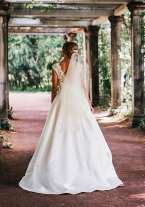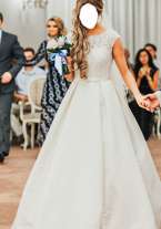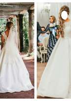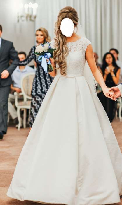 Пышное платье (А-силуэт), ткань - сатиновый атлас, отделка корсета - кружево. Цвет ivory. Пояс с бантиком на талии. Есть карманы. Глубокий V-образный вырез на спине (одевать без лифчика или отдельные чашки). Шлейф. По всей длине юбки - пуговицы, с задней стороны. Платье Naviblue. Оно очень красивое (покупали за 47 500р)! Есть кринолин на 1 кольцо. В идеальном состоянии т.к. было на смену второе платье для банкета. Платье после химчистки и отпарено. Рост 170 + каблуки 10 см.