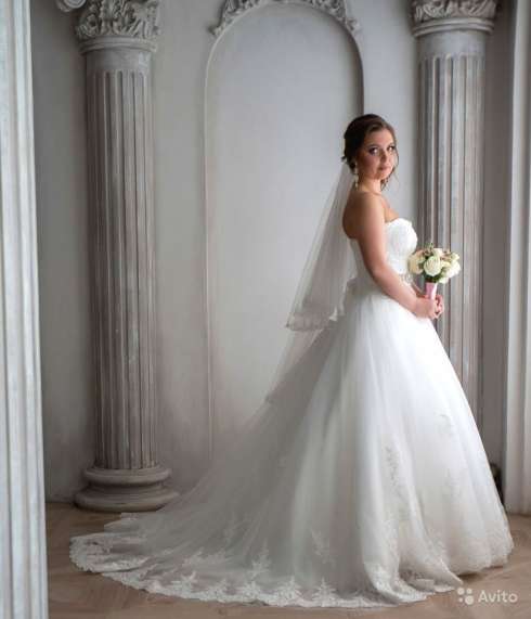 Продаю свое любимое и единственное свадебное платье, уверена другая невеста так же его полюбит, как и я). Покупалось в салоне Венеция (коллекция 16 года, есть чек). Размер 44-46, цвет молочно-белый, корсет со вшитыми чашечками, качественный и удобный, красивый съемный пояс с камнями и стразами, пышная многослойная юбка (атлас + фатин, кольца не просвечивают), по подолу расшитое кружево, небольшой шлейф (при желании можно пристегнуть). Платье после химчистки в идеальном состоянии, без недочетов.