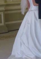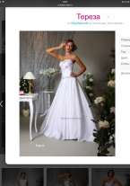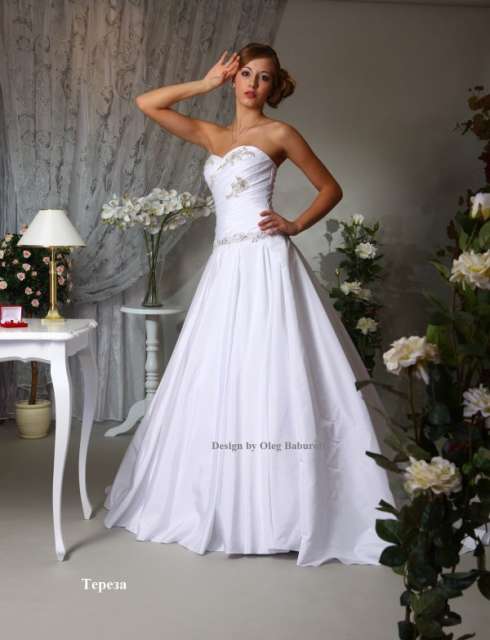 Платье "Тереза", дизайн Oleg Baburov, вырез сердечком, платье пышное А-силуэт. Корсет изысканно украшен стразами. Материал платья белоснежный переливающийся атлас, на фото очень богато смотрится. Есть шлейф. В подарок идет кринолин на 2 кольца. Если хочется чтоб платье было менее пышное то кринолин нужно будет приобрести на одно кольцо. На главном фото кринолин на одно кольцо.