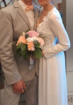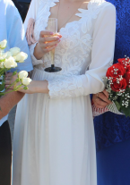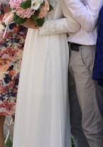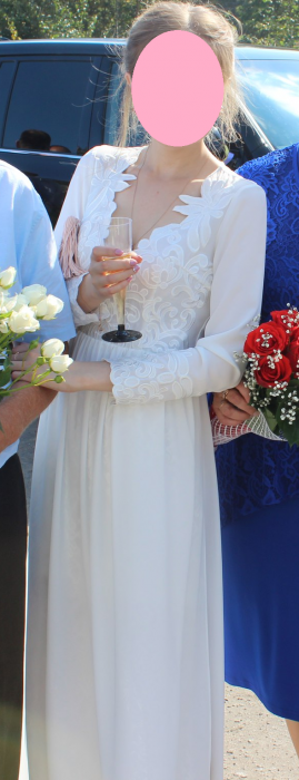 Платье одевала только на церемонию и фотосессию. Состояние идеальное! 3 подклада (нижний короткий,средний длинный кружевной,верхний шифоновый). Рукав и верх расшиты кружевом. Эффектный вырез. Можно посмотреть и примерить! м.Московская СПб. Сзади молния.