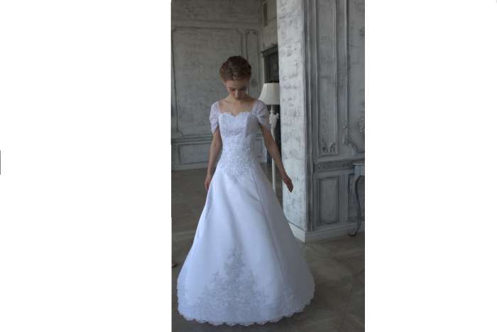 Потрясающее свадебное платье, цвет атласно-белый. А силуэт, РАЗМЕР 42-46. Спина полуоткрыта, корсет с шнуровкой. Подол и корсет вышиты красивыми кружевными узорами РУЧНОЙ РАБОТЫ, которые особенно эффектно смотрятся на фоне гладкой ткани основы и помогают подчеркнуть все соблазнительные изгибы женской фигуры. Узор представлен композицией из бисера, бусин и паеток. Кринолин на 3 кольца в подарок! Платье выглядит очень роскошно и богато. Одевалось один раз, есть квитанция из химчистки.