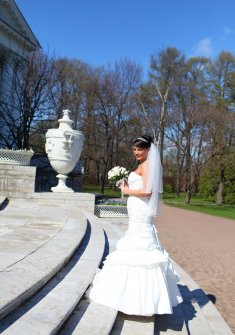 покупалось в августе 2016. в комплекте итальянская фата с бисером ручной работы, кольца, кринолин. в очень хорошем состоянии, отличное итальянское качество. само платье также расшито биссером ручной работы. стиль: рыбка