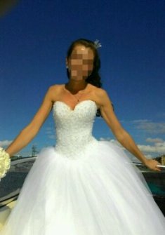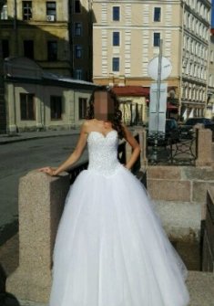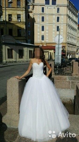 Платье покупалось на второй день, почти не носилось. Очень красивый корсет, состоит полностью из кристаллов! На солнце играет, нет слов!!! Вырез корсета капелькой. Корсет отлично держит грудь или создает иллюзию её наличия:-) Подходит от 40 (как у меня) до 44 размера! Юбка очень пышная, кринолин не нужен. Я покупала его, но почти сразу сняла! Рекомендую.