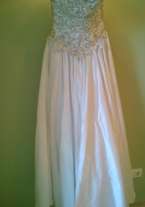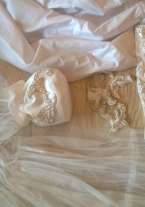 Можно и на меньший размер, т.к. сзади шнуровка садиться четко по фигуре. Шикарное, как у золушки. В фирменном пакете. Загрязнено только по низу, без пятен и повреждений. в химчистке не было и не стиралось. Сзади слетела собачка. Под точечным освещением все переливается и мерцает. Лиф расшит сваровски, есть нижняя юбка и подьюбник, в комплекты идут перчатки на один палец (тоже расшиты), сумочка и украшение для волос. Также трехъярусная фата вся проклеена стразами по каждому ярусу.