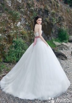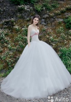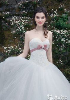 Продам красивое свадебное платье в идеальном состоянии. Декорировано под грудью лентой. Верх корсета полностью кружевной, цвет чисто белый! Платье со шлейфом 100 см. Очень красивое. Размер от 42 до 44...регулируется шнуровкой. На рост 160-175 см. Платье не мнется, легкое и удобное. Подарок – аксессуар к свадьбе и кринолин 7 колец.
