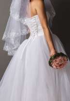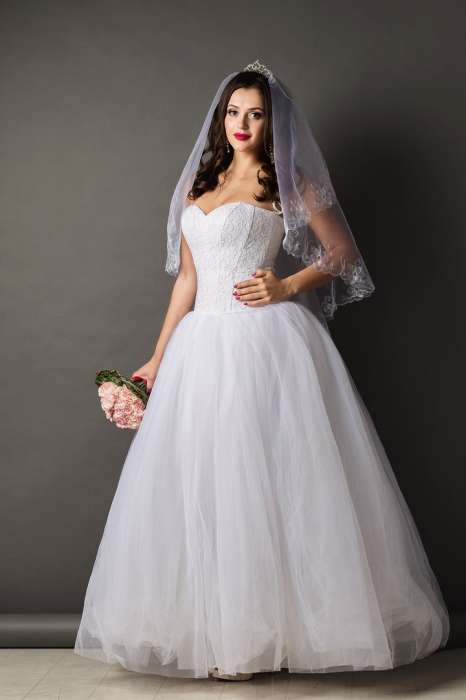 Продам свадебное платье б/у, белое, размер регулируется за счет шнуровки на корсете от 44 до 48, талия заниженная,платье пышное в хорошем состоянии, на фото подьюбник без колец, на фото рост 177+ каблук, в подарок отдам украшения колье, серьги, фата.