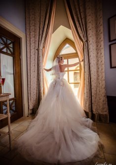 Дизайнерское платье! Ткани: матовый сатин, английский фатин. Корсет расшит в ручную японским стеклярусом, жемчугом и кристаллами Swarovski. Размер регулируется за счёт шнуровки. Вшиты чашечки. Юбка пышная (пышность зависит от количества колец на кринолине), собирается сзади в драпировку и украшена тремя комплектами шелковых цветов. Шлейф 1 метр, подвязывается на ленты. Платье после химчистки, в идеальном состоянии. В чехле. В подарок: кринолин на два кольца и шикарная фата.