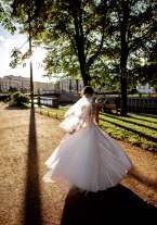 Платье делает талию как у принцессы! Очень красивая шнуровка на спине! У платья есть небольшой подол (для фотосессии). Для удобства при ходьбе сделана невидимая пуговичка, которая забирает подол. В комплекте с платьем идет фата, кринолин на одно кольцо, чехол. Платье после химчистки, в идеальном состоянии, т.к. очень бережно следила за ним во время свадьбы. Если нужно будет, могу прислать больше фотографий.