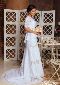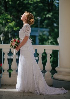 Элегантное кружевное свадебное платье, подойдёт на размер 42-46 (сзади шнуровка), небольшой шлейф, прилагается кружевное болеро, пояс, украшенный стразами. После химчистки, в хорошем состоянии.