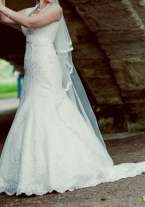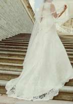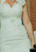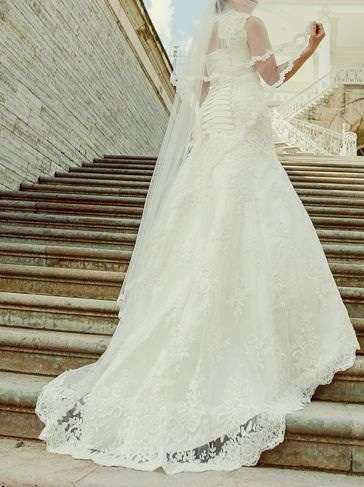 Силуэтное платье со шлейфом. Очень красивое и легкое. Регулируется размер благодаря шнуровки на спине. В подарок отдам длинную фату, чехол под платье и криналин на два кольца.