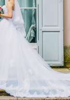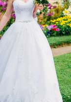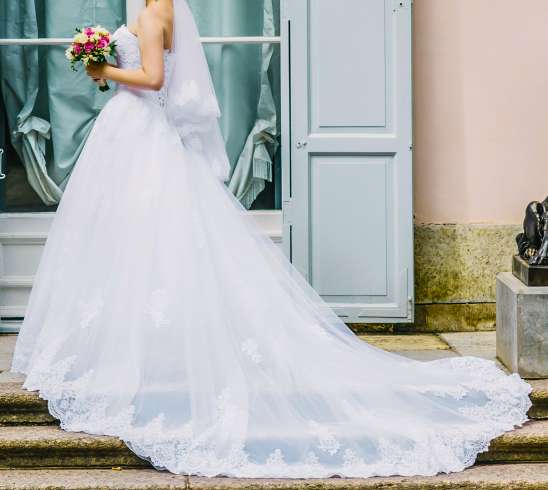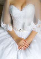 Продам пышное свадебное платье (белое). Открытый кружевной корсет без бретелей с вырезом декольте. Линия талии акцентирована поясом с узором из бисера и стекляруса. Пышная кружевная юбка со шлейфом, который можно пристегнуть и подол платья становится одной длины. Размер: 42−44 (S). Мой рост 165 + каблуки 6 см. В отличном состоянии, одевала один раз, хранение - в чехле, после химчистки. Возможен торг!