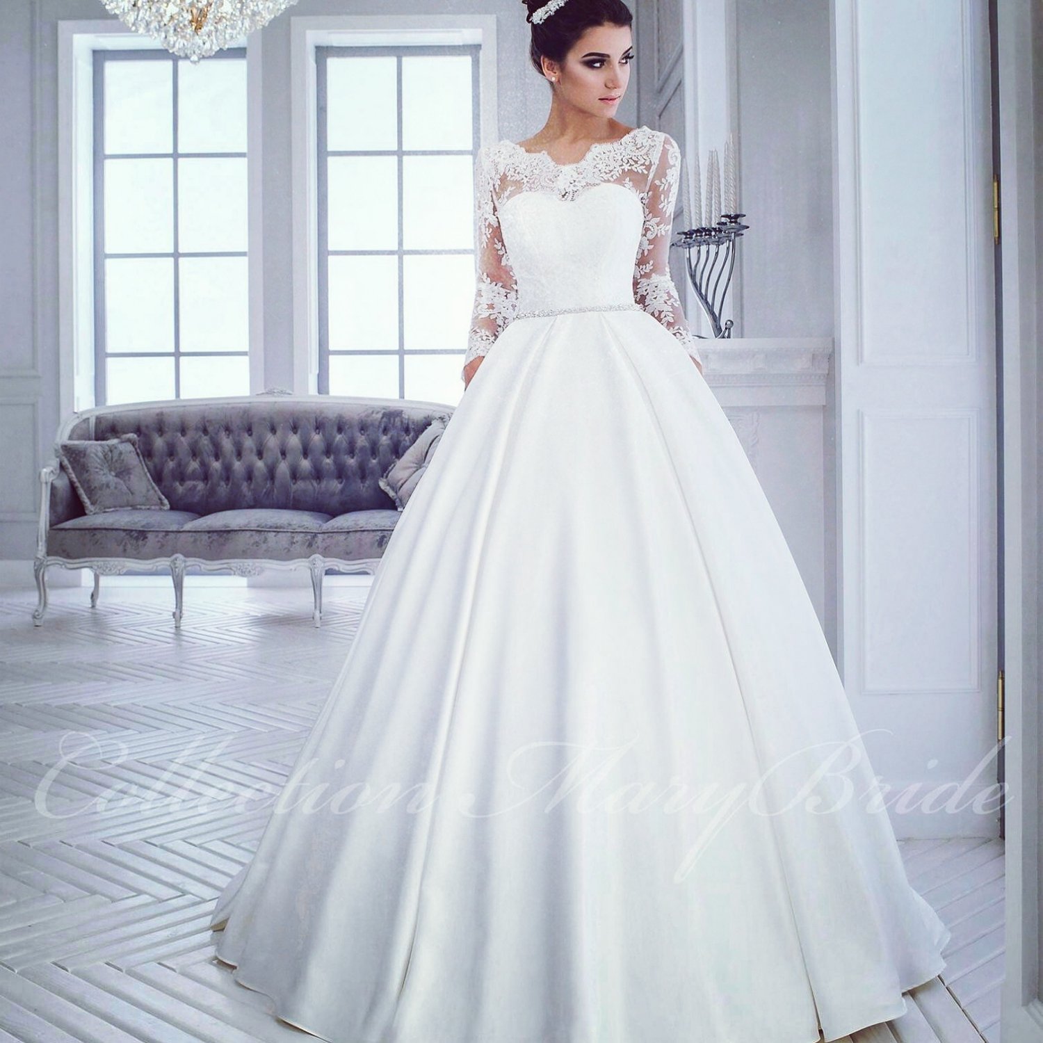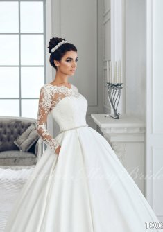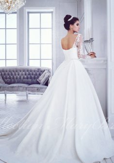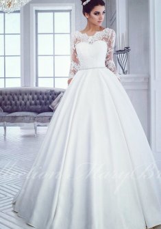 Белоснежное свадебное платье с кружевными рукавами и атласной юбкой со шлейфом, практически новое в отличном состоянии, платье после химчистки. Размер 40-44 рост 165-175. Посмотреть и померить можно в Колпино.