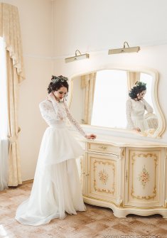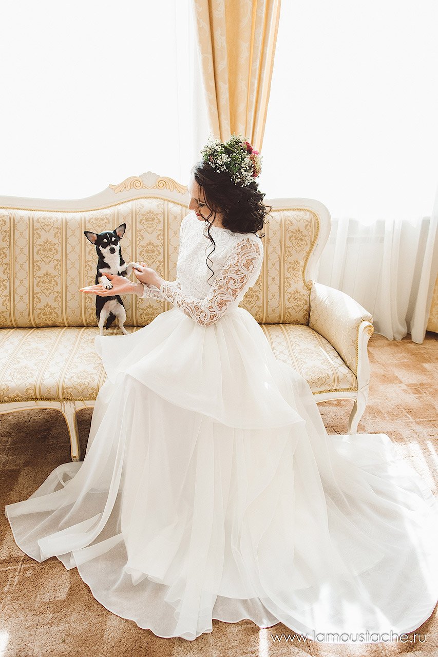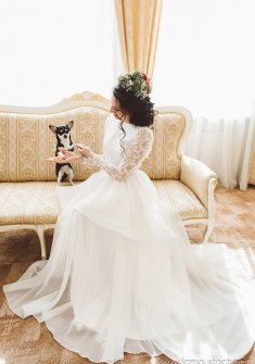 Платье в идеальном состоянии. Верх выполнен из гипюра по подкладе, спинка открыта до талии. Юбка сделана из органзы. Есть еще съемная юбка на широком поясе, спереди она короткая и плавно переходит в шлейф. На фото платье вместе со съемной юбкой