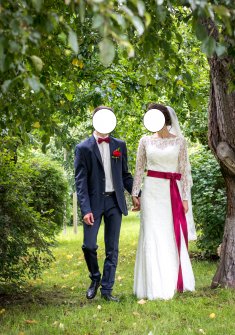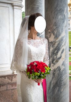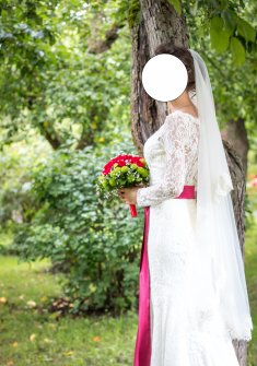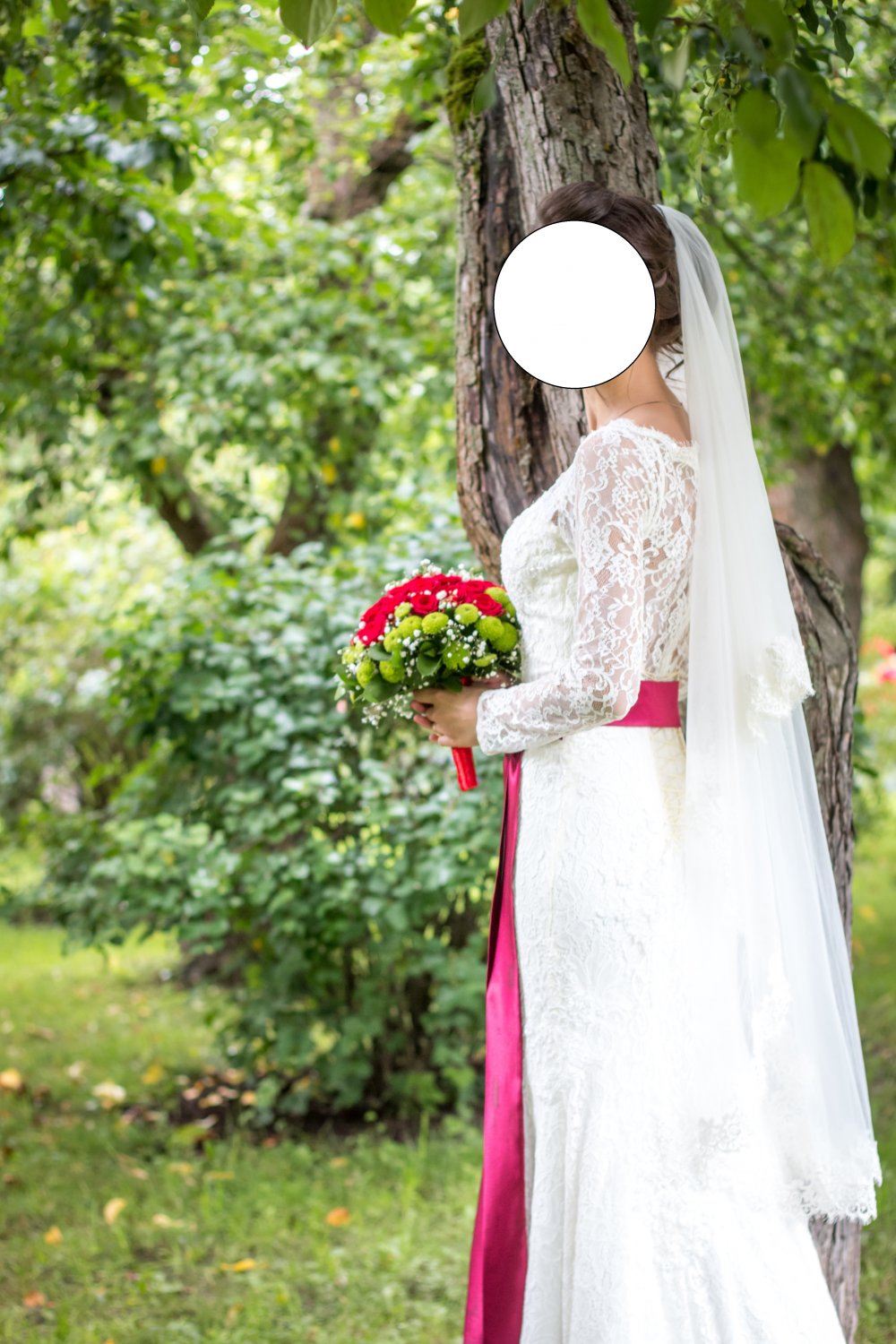 Очаровательное гипюровое свадебное платье с кружевными рукавами и спиной в винтажном стиле, расшитое бисером. Цвет айвори. Юбка плавно расширяется от колена к низу и имеет небольшой шлейф. Платье довольно легкое, удобное и не мнется. Платье в идеальном состоянии, только что из химчистки. В комплекте с платьем идет легкая длинная фата цвета айвори, расшитая кружевом по краю. А также атласный пояс вишневого цвета с бантом в пол, шитый на заказ. В подарок идет свадебная бутафория. Торг уместен.