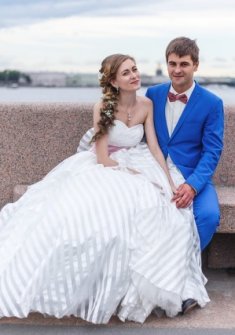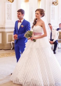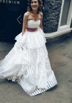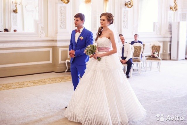 Свадебное платье интересного кроя. На фото платье с кринолином на два кольца. На последних 2 фото без колец. Продается без колец!!! Показано на рост 170, размер 40. На фото длина платья с каблуком на 8 см. Цвет молочный. Состояние идеальное. Материал полупрозрачный с полосками. Не блестящее. Корсет на шнуровке. Платье после химчистки. Стоимость в магазине 51800 руб. К платью идёт пояс атласный что на фото + чехол в подарок. Также с платьем отдам фату. Фата с атласной лентой по краям.