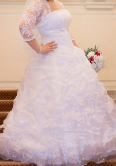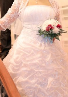 белоснежное платье, лиф украшен жемчужинками. Корсет 3 слоя юбки. На животе вышивка. Покупала за 12 тыс в ноябре 2014года, отдаю за 3000 так как без химчистки (край платья внизу немного испачкан, в остальном идеальное состояние). Вместе с платьем отдаю кринолин 3 кольца +чехол для платья. И подарок - сумочка невесты специально под это платье.