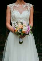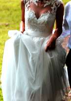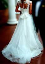Платье А- силуэта. Расшитый кружевной корсет ручной работы. Платье выполнялось под заказ. Сзади жемчужные пуговки, шлейф и бант. Размер: 40-42, варьируется шнуровкой. Рост: 164, без каблука. Цвет: молоко. Надевалось 1 раз, после химчистки, состояние идеальное. Есть чехол.