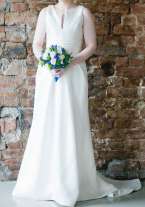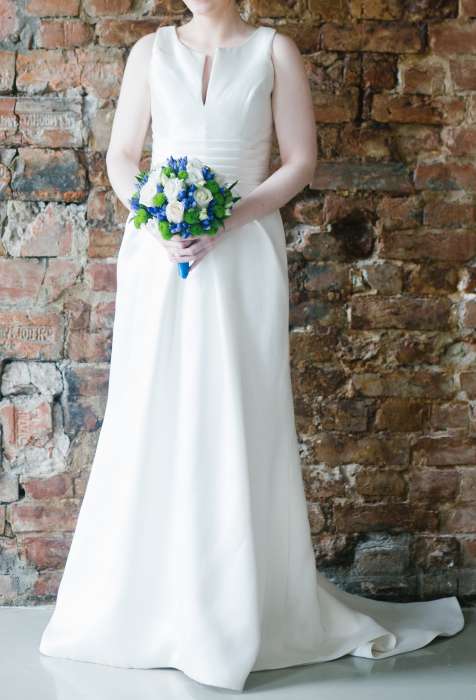 Платье цвета слоновой кости. На рост 164 см + каблуки 9-10см. Широкий шлейф при необходимости можно пристегнуть Платье на молнии, которая скрыта рядом пуговиц.в нем очень удобно, нет дополнительных подъюбников. Объем создан за счет кроя. Изюминкой так же является наличие карманов !Чашечки вшиты, что удерживает грудь и форму. Одевалось один раз, после химчистки выглядит идеально!