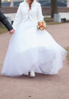 Свадебное платье подходит для размера 42-46 за счет корсета, рост 160-170, также хорошо подходит для беременных на ранних сроках. Платье без дефектов. Надевалось один раз, после чего прошло химчистку. В комплекте диадема и подъюбник с кольцами.