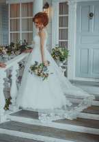 Платье сшито из качественного кружева(Франция).Цвет ближе к айвори. Каждый элемент кружева пришит вручную.Фактурные цветы выкладывались по горловине, шлейфу,юбке, создавая,красивый рисунок.Платье продается с кринолином на одно кольцо.В платье удобно ходить и танцевать.Шлейф отстегивается,крепится на незаметные пуговицы.Спинка застегивается на ряд пуговиц.Кружево расшито прозрачными мелкими пайетками,они незаметны,но создают эффект мерцания.Одевалось один раз,сохранилось в отличном состоянии.