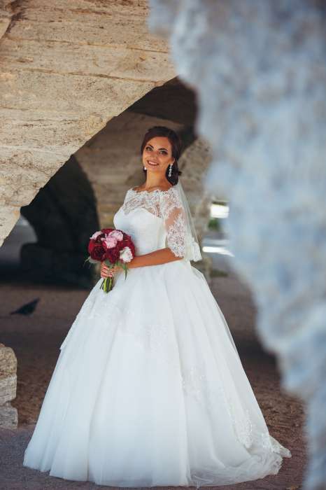 Красивое платье А-силуэта со шлейфом (его моно пристегнуть), цвет - Айвори, французское кружево. В идеальном состоянии, сделана химчистка (одевалось один раз). В подарок - кринолин (3 кольца), а также очень красивая фата с кружевом (абсолютно новая, покупала за 6500 руб).